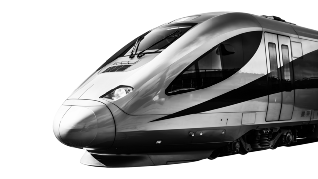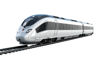 Sleek, white high-speed rail train on tracks, set against a dark, transparent background