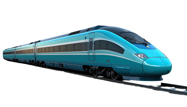 Sleek turquoise high-speed train glides along the tracks, isolated on black