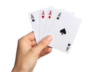 Holding four aces, a winning hand of poker cards, symbolizing luck and success in a game of chance