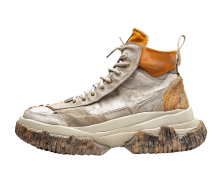Trendy high-top sneaker with unique design, isolated on a white background.