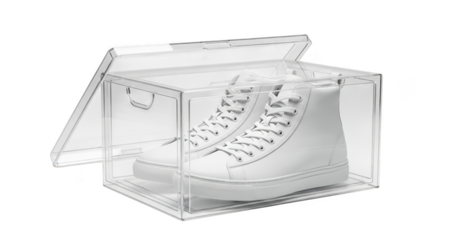 Clear acrylic box with white high top sneaker isolated on transparent background