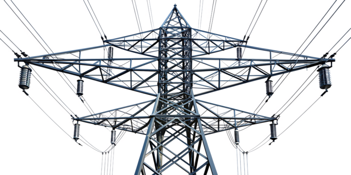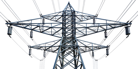 High-voltage electricity pylon, isolated on transparent background