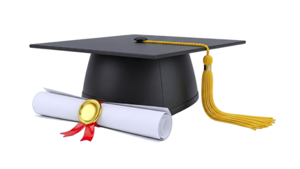 Isolated graduation cap and diploma scroll tied with ribbon, signifying academic achievement
