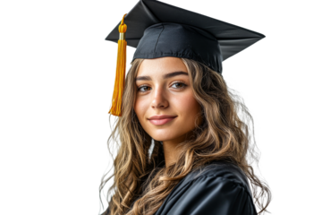 Smiling graduate in cap and gown, higher education achievement, cut out transparent