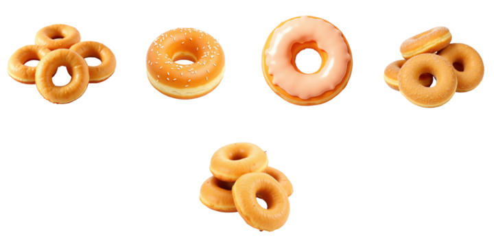 Assorted donuts including classic ring, glazed, and filled varieties arranged artistically against a transparent background highlighting their texture and colors.