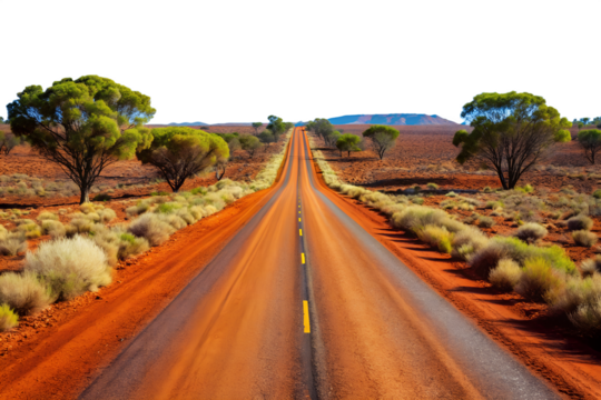 A long, straight road through the australian outback with red earth and sparse vegetation isolated on transparent background