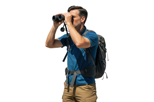 Man with backpack and binoculars looking intently into the distance