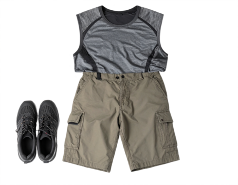 Active man's summer outfit casual cargo shorts athletic tank top and hiking shoes