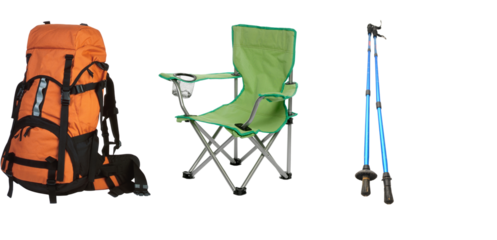 Camping bag With Chair With Stick Hiking Backpack with Rolled Sleeping Bag, Side PNG Travel bag with attached neck pillow Transparent background, PNG file Vintage Backpack In Halftone