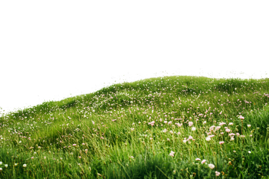 Lush green hillside dotted with wildflowers under bright sunlight isolated on transparent background