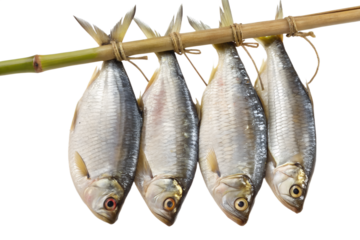 Bright High Quality  Realistic Ilish Fish Hanging on Stick PNG | Fresh Hilsa Fish