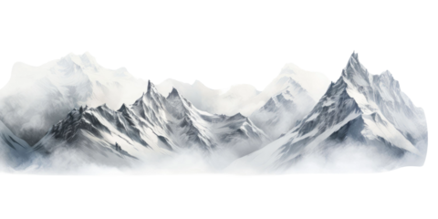 The horizontal landscape of white tall majestic mountain peaks ranges cut out, isolated, transparent background - PNG.
