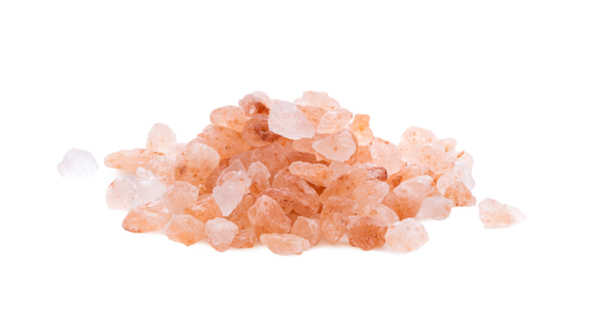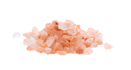 Scattered pink Himalayan salt granules with soft crystal reflections, spa and wellness concept, isolated on white background, PNG format
