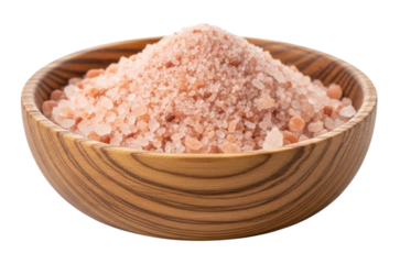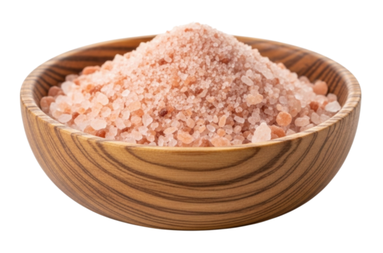 pink Himalayan salt in wooden bowl isolated on white background, HD realistic