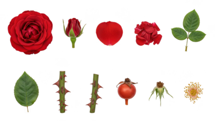 Collection of rose plant parts including flower, bud, petal, leaves, stem with thorn, and hip isolated on transparent background