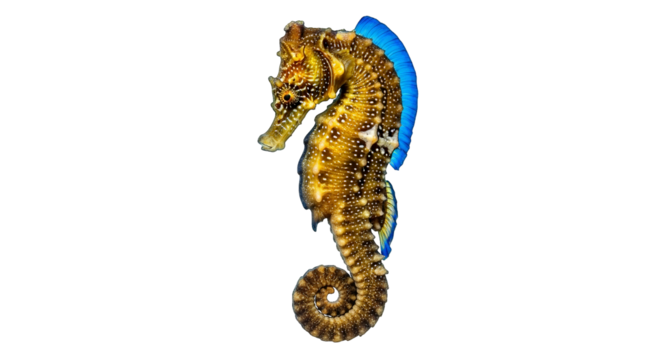 Striking seahorse with golden brown body and vibrant blue fins set against a stark black background