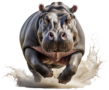 Angry hippopotamus running in water isolated on white background as transparent PNG, generative AI animal