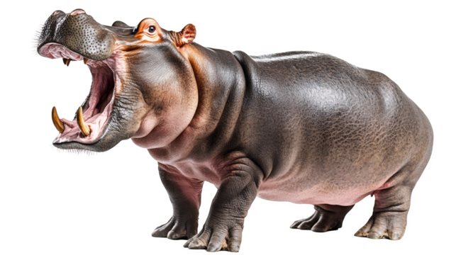 A powerful hippopotamus with its mouth open isolated on a transparent background, PNG