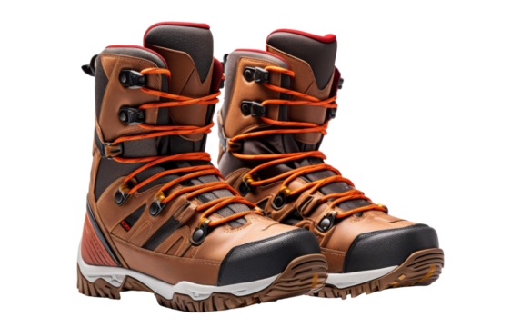 Two brown boots with striking orange laces standing side by side