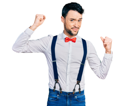 Hispanic man with beard wearing hipster look with bow tie and suspenders showing arms muscles smiling proud. fitness concept.