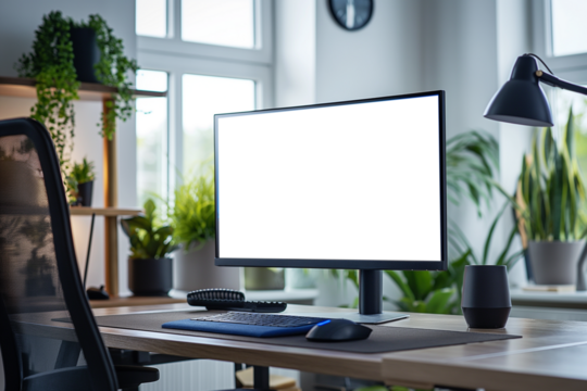 Blank Screen Desktop on wood table in the office, advertisement and promotion, Empty, Template, Transparent, cut out