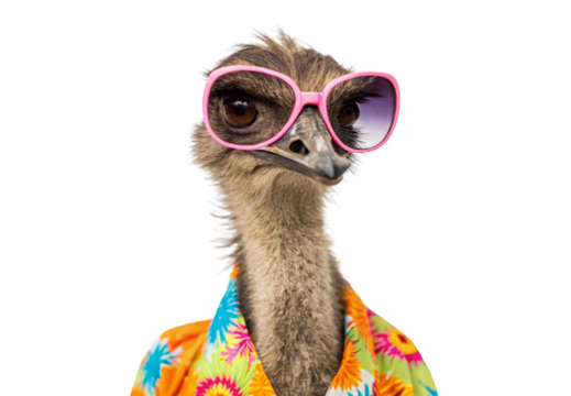 Stylish ostrich with oversized pink sunglasses and vibrant tie-dye clothing, isolated on a transparent background