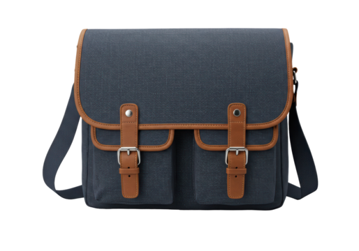 Isolated Stylish Blue Canvas Messenger Bag with Leather Accents