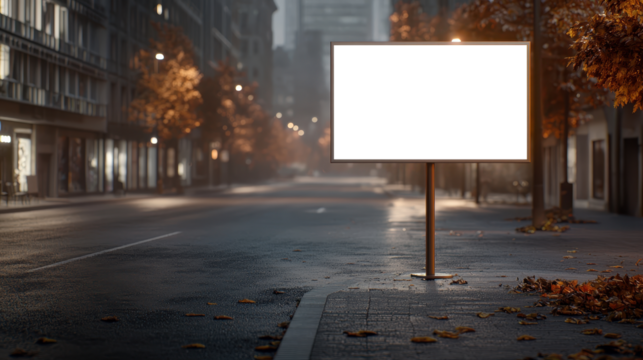 Transparent billboard on quiet city street with autumn leaves and evening lighting