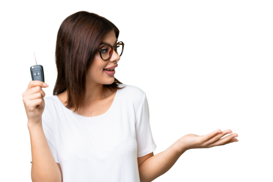 Young caucasian man holding car keys isolated pointing upside with opened mouth.