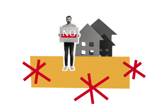 Collage young man stand hold placard no deny refusal disagree homeless apartment accommodation refugee settlement drawing background
