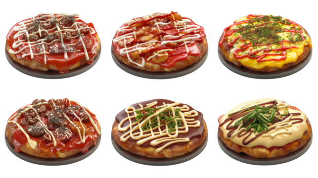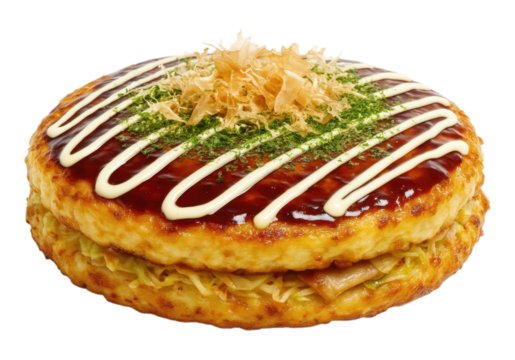 Authentic Okonomiyaki, a Japanese savory pancake topped with sauce, mayonnaise, aonori, and bonito flakes, Isolated on Transparent and White Background