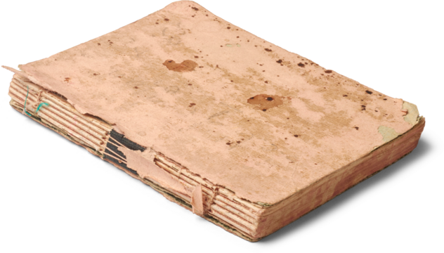 close-up of closed worn vintage book, faded pink cover with brown stains and peeling edges, broken spine exposing binding threads isolated white background, history and antique literature concept