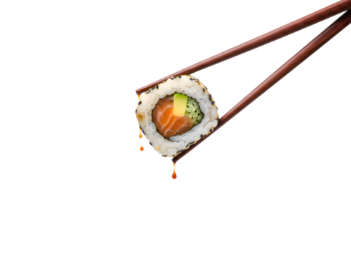 Fresh Salmon Avocado Sushi Roll with Chopsticks & Dripping Sauce. Authentic Japanese Cuisine Delicacy on white background Isolated on Transparent Background