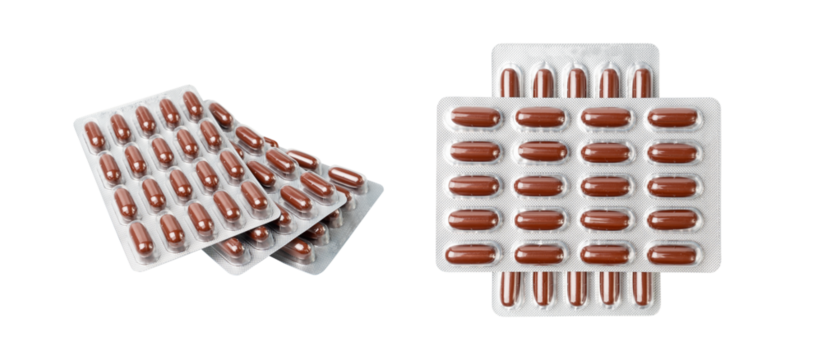 Cranberry Capsules, Garlic Extract Pills, Herbal Capsules Isolated, Analgesic Aluminum Blister, Painkiller Drugs, Sedative Pills Pack, Cranberry Medicine Powder Capsules on White Background
