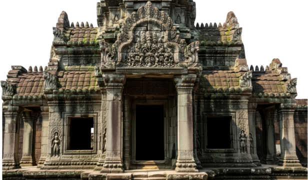 Ancient weathered stone temple entrance featuring intricate carvings moss growth on tile roof sections and flanking decorative sculpted figures 195 characters Architecture Sculpture