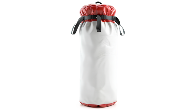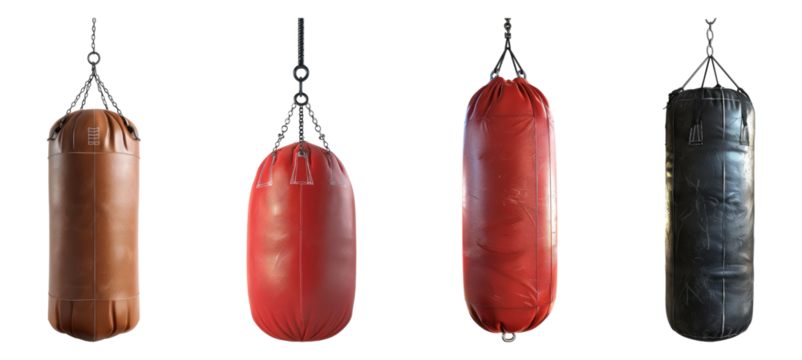 Black leather punching bag hanging, isolated on transparent background, ready for your next workout montage