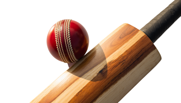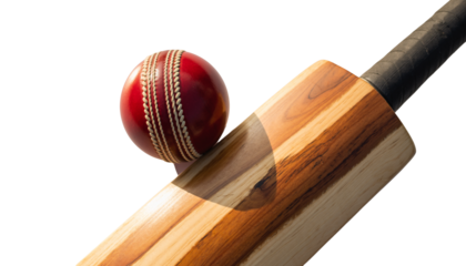 A cricket bat made of light wood and a red ball are visible against a bright background with motion effect  present on white background PNG