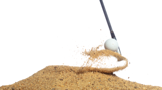 Golf ball explode from sand bunker. Golfer hit ball with club to sand explosion to green. Golf club hit ball in sand bunker explosion. White background isolated freeze motion