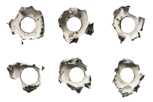 Set of metal bullet holes displayed in transparent PNG image format with clean white background