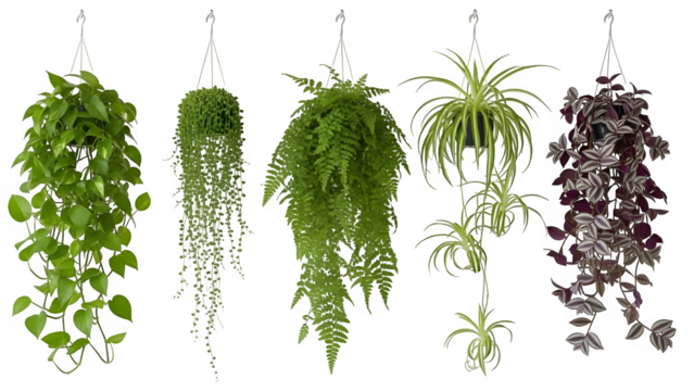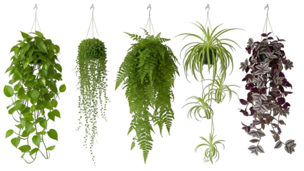 Five hanging plants isolated on transparent background