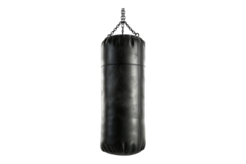 Black leather punching bag hanging, isolated on transparent background, ready for your next workout montage