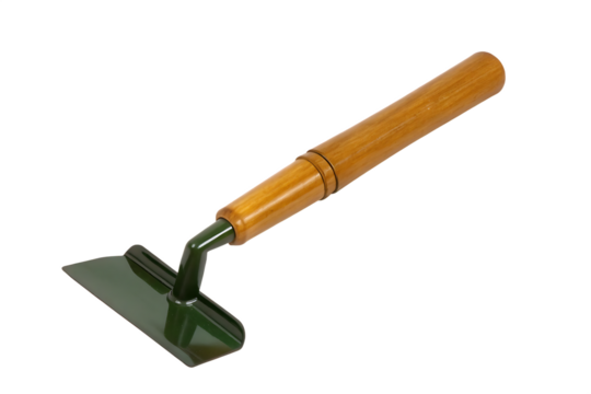 Green-handled gardening hoe with wooden shaft, metallic blade gleaming against transparent backdrop, ready for agricultural work
