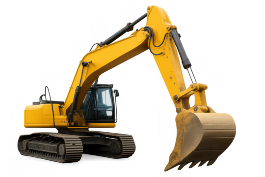 Yellow tracked excavator with hydraulic arm and digging bucket on transparent background performing construction work