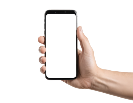 Hand holding mobile phone with transparent background