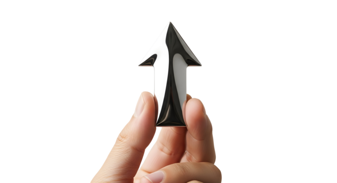 Hand holding a blue arrow pointing upwards isolated on transparent background