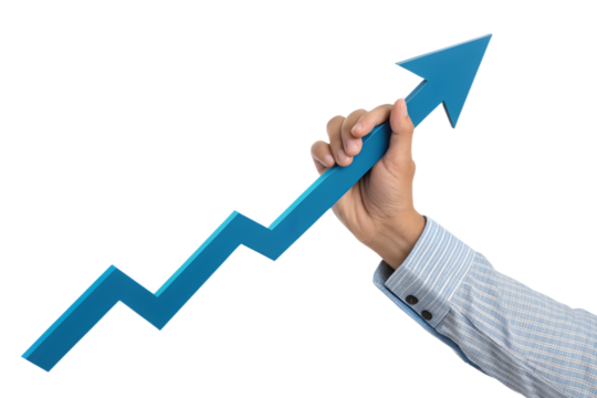 Hand holding blue arrow upward: growth and success concept on transparent background