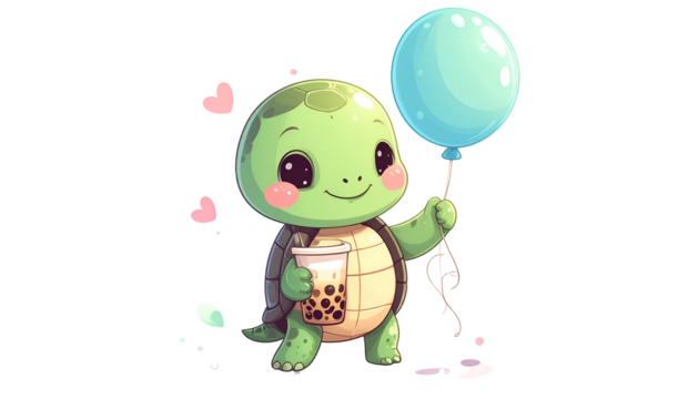 Animated turtle, holding a balloon and boba tea, surrounded by hearts