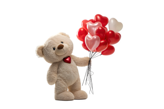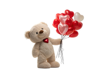 A fluffy teddy bear holds a bouquet of red and pink heart balloons isolated on transparent background