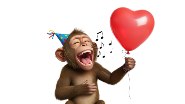 Happy Cartoon Monkey Wearing Party Hat and Holding Red Heart Balloon isolated PNG with Transparent Background