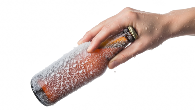 Cold beer bottle with condensation held in male hand, refreshing alcoholic beverage for summer, drinks, or bar themes isolated on transparent background